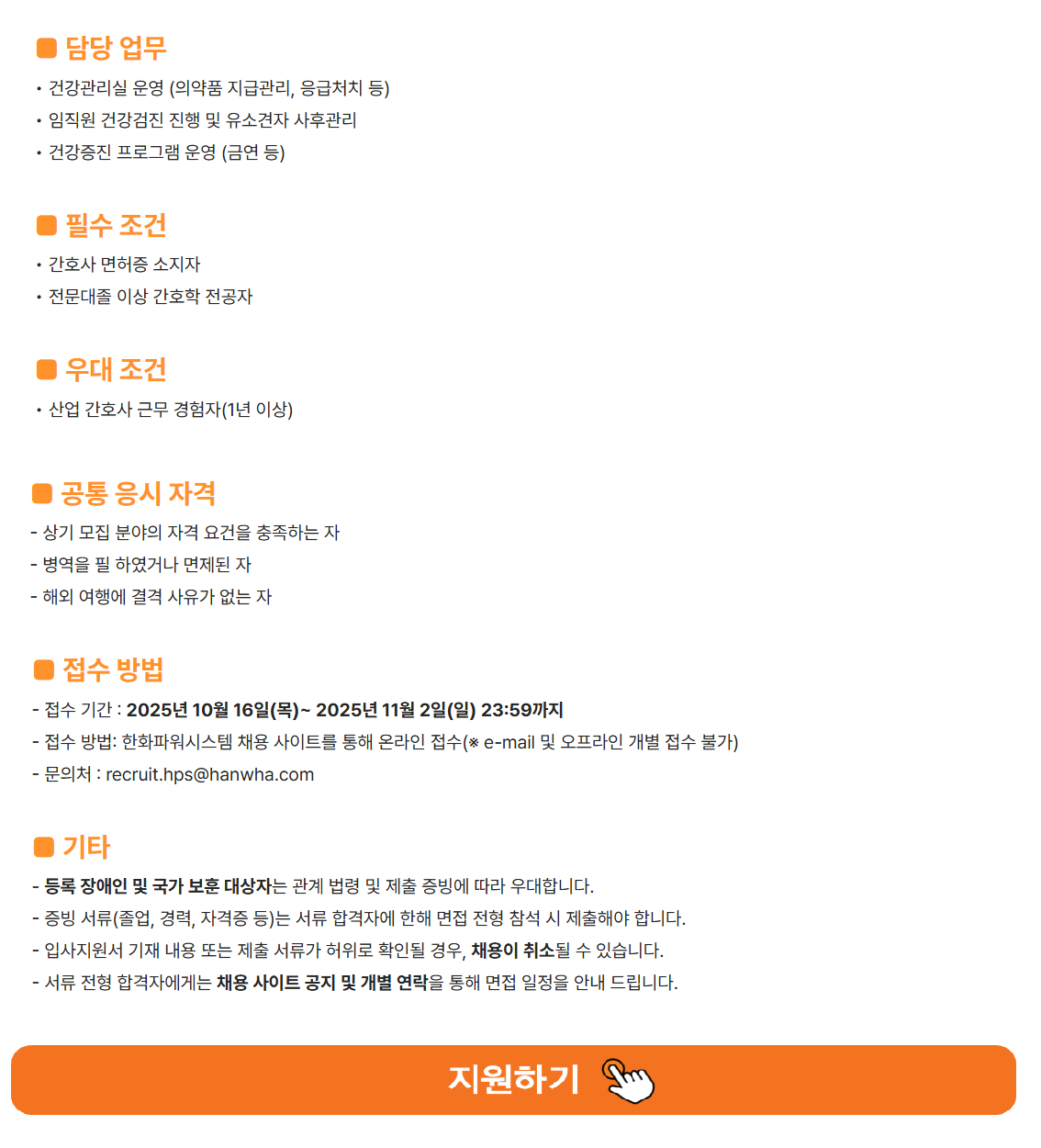 [판교] 한화파워시스템 산업간호사(계약직) 채용