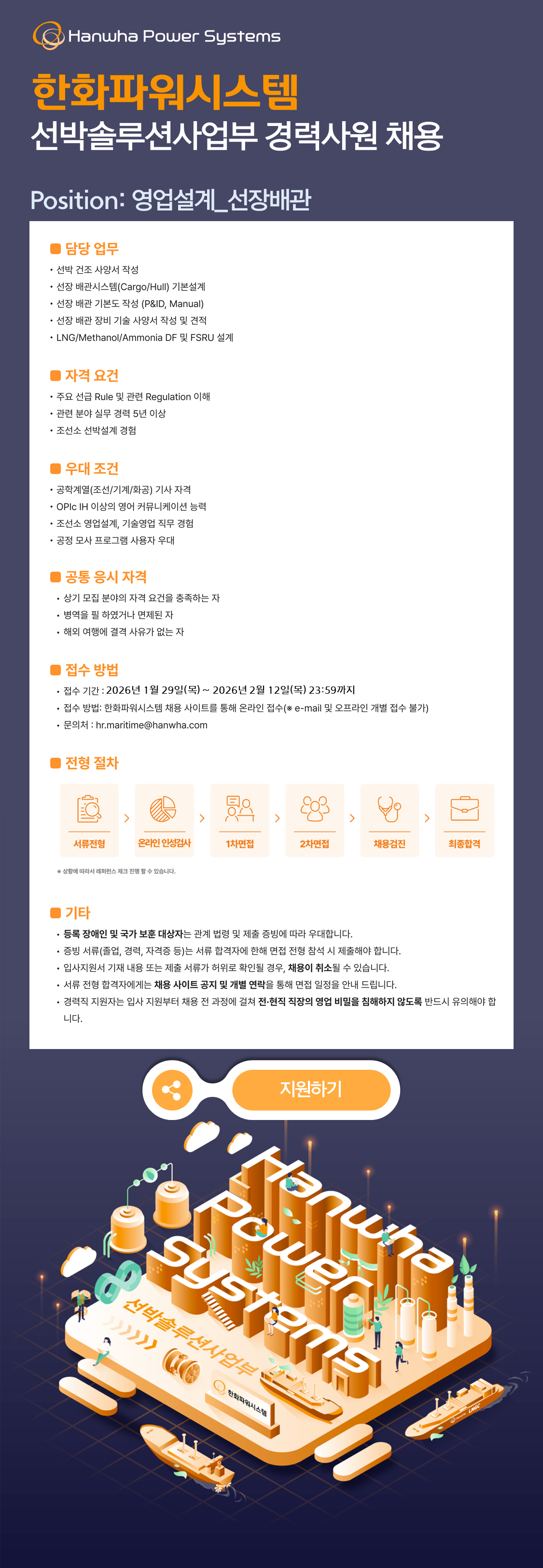 선박솔루션사업부(부산) 설계(선장배관) 경력사원 채용
