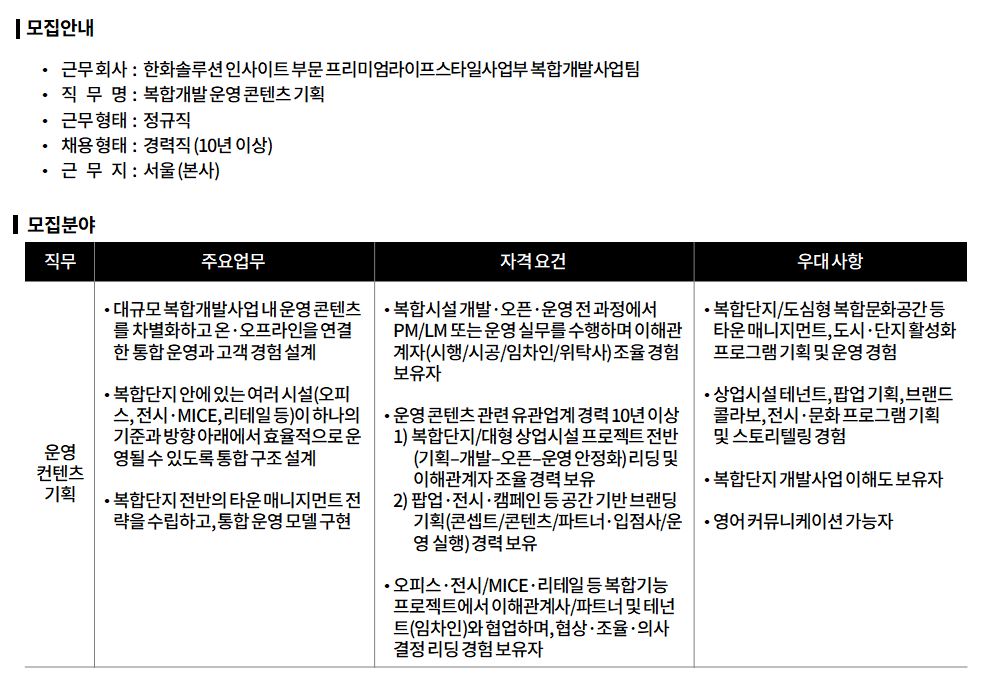 한화솔루션 인사이트 PLS사업부 복합개발 운영 콘텐츠 기획 경력 채용