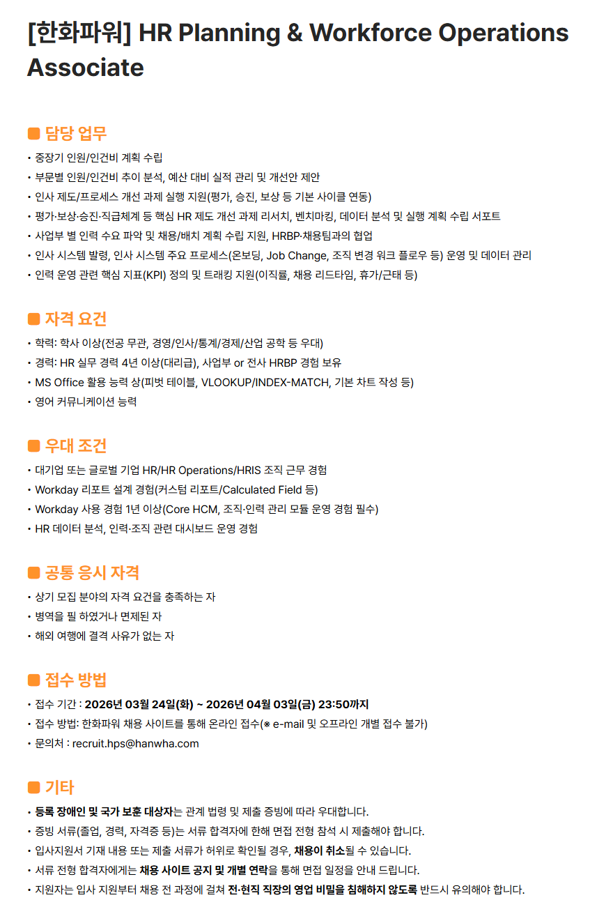 [한화파워] HR Planning & Workforce Operations Associate